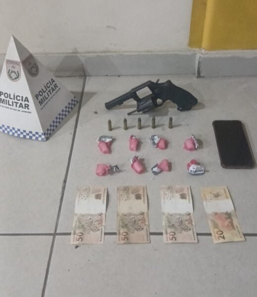 No momento da abordagem, o adolescente tentou fugir e arremessou um objeto ao chão. Segundo os policiais, tratava-se de um revólver calibre 38 com numeração suprimida. Com ele também foram encontrados cinco munições intactas, R$ 170 em espécie, um celular e oito porções de cocaína.