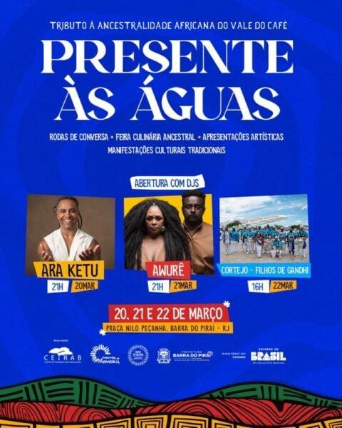 Barra do Piraí – Barra do Piraí será palco, entre os dias 20 e 22 de março, da 1ª edição do ‘Presente às Águas – Tributo à Ancestralidade Africana do Vale do Café’ um evento cultural que vai reunir música, tradição, arte e reflexão sobre a herança africana na região. A programação acontece na Praça Nilo Peçanha, no Centro, com entrada gratuita.