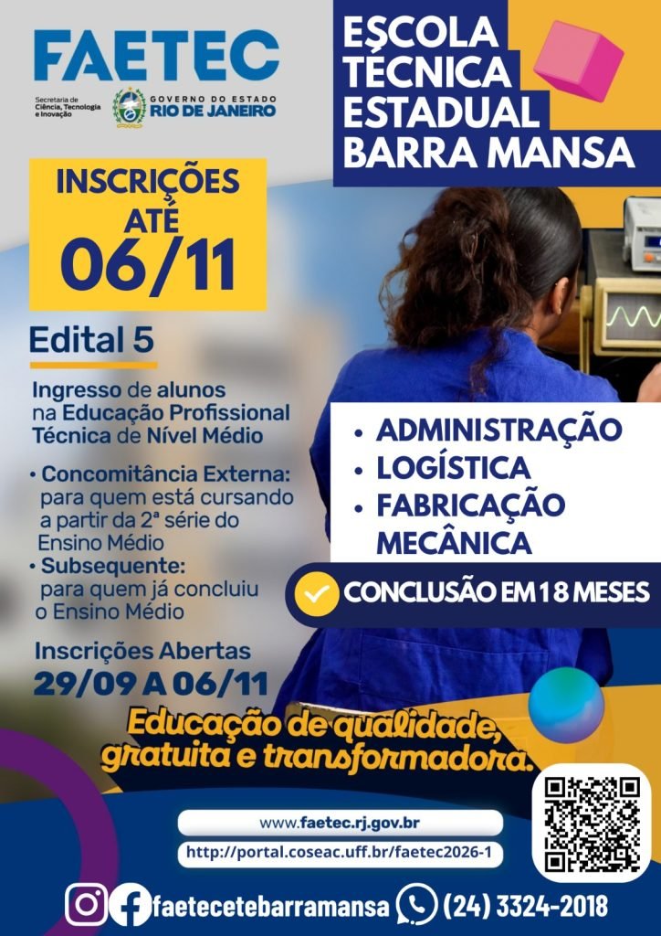 As inscrições da Faetec (Fundação de Apoio à Escola Técnica do Estado do Rio) 2026.1 para vagas em cursos gratuitos para Escola Técnica Estadual Barra Mansa terminam nesta quinta-feira (6). Segundo a fundação, as inscrições podem ser feitas pelo site portal.coseac.uff.br/faetec2026-1