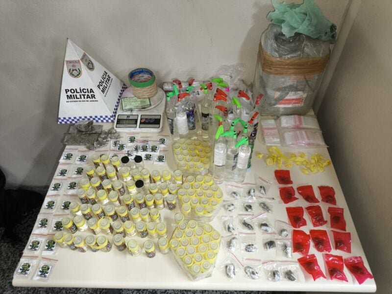 Foram apreendidas 30 porções de cocaína, 117 frascos de loló, cinco litros da substância acondicionados em um galão plástico, 24 pedras de crack, além de tabletes e trouxinhas de maconha. Também foram recolhidos uma balança de precisão, material para endolação e frascos de lança-perfume. Um documento de identidade foi encontrado no local.