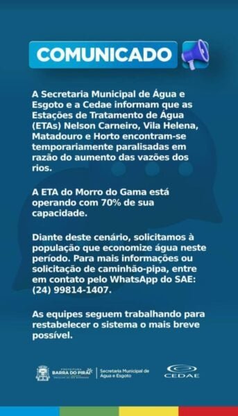 Diante do cenário, a SAE solicita que a população economize água durante este período, utilizando o recurso de forma consciente até a normalização do sistema. Para mais informações ou solicitação de caminhão-pipa, os moradores podem entrar em contato pelo WhatsApp do SAE, no número (24) 99814-1407.