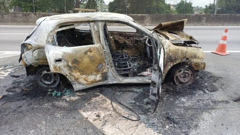 Carro pega fogo e é destruído por pane mecânica na Dutra, em BM