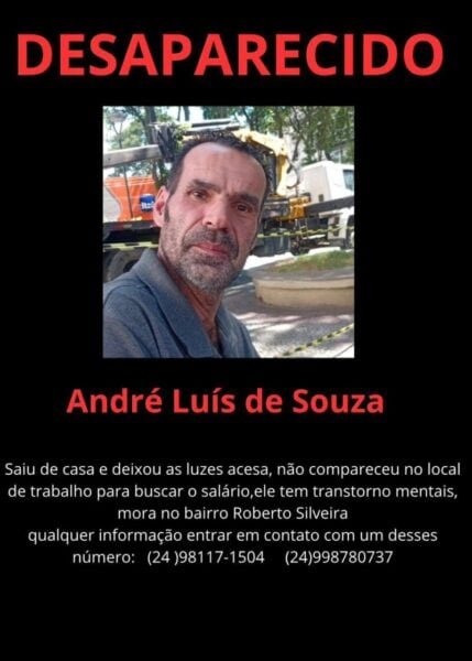 A família pede que qualquer pessoa que tenha informações sobre o paradeiro de André Luís de Souza entre em contato pelos telefones (24) 98117-1504 ou (24) 99878-0737.