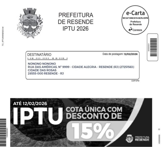 Resende – A Prefeitura de Resende divulgou o calendário oficial de pagamento do IPTU 2026. O imposto poderá ser quitado em cota única ou de forma parcelada em até dez parcelas mensais, conforme decreto municipal. O pagamento em cota única garante desconto de 15%, desde que seja realizado até 12 de fevereiro de 2026, data que também marca o vencimento da primeira parcela para os contribuintes que optarem pelo parcelamento.