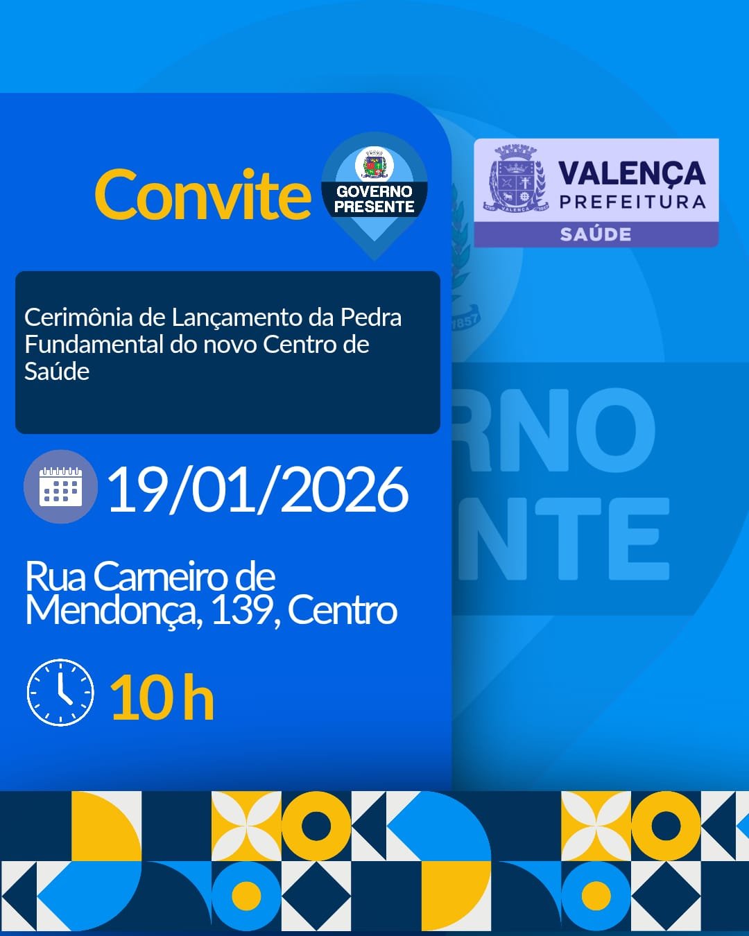 A Prefeitura de Valença / Governo Presente realiza, na próxima segunda-feira, 19 de janeiro de 2026, às 10h, a cerimônia de lançamento da pedra fundamental do novo Centro de Saúde do município. O ato simbólico marca o início das obras de uma unidade que irá ampliar e qualificar a rede municipal de atendimento em saúde.