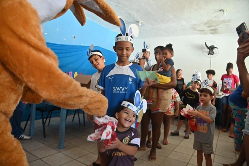 Durante a ação, voluntários participaram da entrega e promoveram atividades recreativas. Um personagem caracterizado como coelho da Páscoa também esteve presente, interagindo com as crianças.