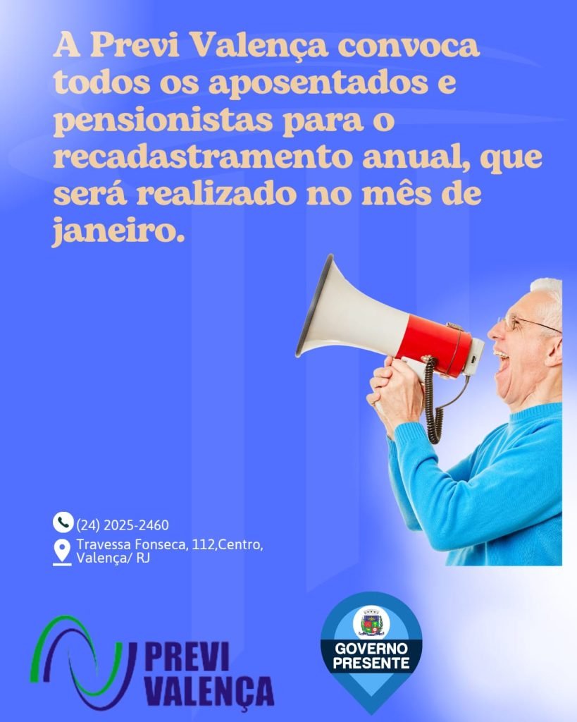 O Instituto Municipal de Previdência Social dos Servidores Públicos de Valença (Previ Valença) iniciou o Recadastramento Anual de Aposentados e Pensionistas, que será realizado durante todo o mês de janeiro de 2026, na sede do instituto, localizada na Travessa Fonseca, nº 112, no Centro de Valença.