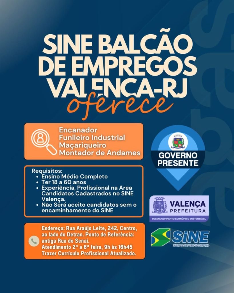 O SINE Balcão de Empregos de Valença está com novas oportunidades para profissionais das áreas de encanador, funileiro industrial, maçariqueiro e montador de andaimes. As vagas exigem ensino médio completo, experiência comprovada e idade entre 18 e 60 anos. Os candidatos devem estar cadastrados no SINE e comparecer ao posto na Rua Araújo Leite, 242, Centro, ao lado do Detran, de segunda a sexta-feira, das 9h às 16h45, levando currículo profissional atualizado. Candidatos sem encaminhamento do SINE não serão aceitos.
