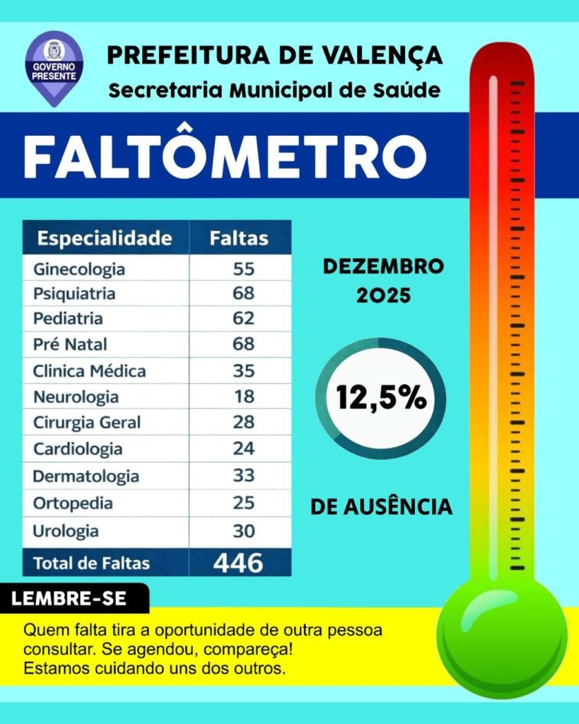 A Secretaria Municipal de Saúde de Valença divulgou os dados do “Faltômetro” referentes ao mês de dezembro de 2025. No período, foram contabilizadas 446 ausências em consultas médicas, alcançando um índice de 12,5% de não comparecimento.